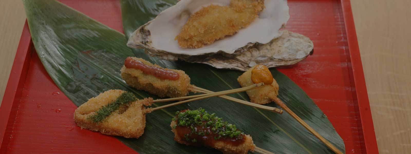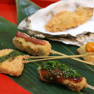 Breaded and deep-fried skewers of various meats, vegetabes, and seafood that comes with a thick sweet dipping sauce.